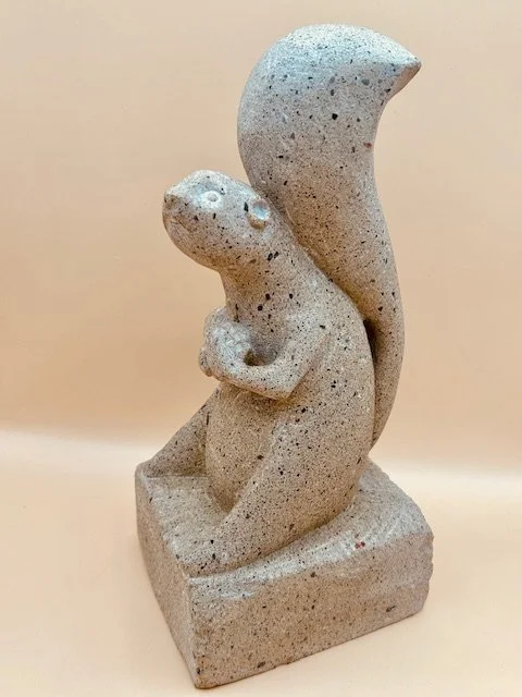 For your consideration is Stevie the Squirrel. Stevie has just found a peanut and he is guarding said peanut with his life as if someone is ready to strip it away from him. My inspiration for Stevie, besides the multitude of voracious squirrels in the backyard who will commit squirrelicide for a peanut, is all those people way back in the pandemic days, the hoarders of - of all things- toilet paper. A clean butt apparently was THE most important issue on their minds at the time, never mind grandma at the nursing home. The irrational hoarding was mind-boggling and I am sure we will see it again. Stevie here turned out well, but alas was cursed with bad stone like the tugboat with the chocolate chip cookie dough stone. Very distracting. so while Stevie turned out well his complexion was a downer. Stevie was eventually left on the streets and found a new home under the Easter Egg Project 2026.