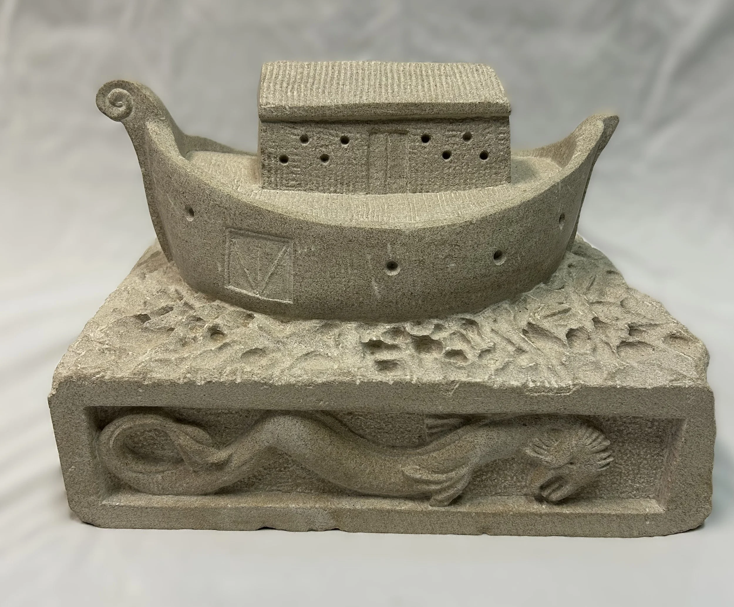 This was a long time in the making. I had originally started on a Noah’s Ark a few years ago but the boat split from the sea- not exactly biblical. So I thought I’d try again. The inspiration came from a sculptor named William Edmondson and his sculpture of the same name, and as I re-look at his work I can see a lot of influence in mine. Huh. Anyway, this is by far the heaviest piece if nothing else, depicting a stylized ark on heavy seas. While you can’t see it here, some sea serpents also circle the ark (make of them what you will- if you don’t like them as not being accurate to the story, well, go make your own ark.) A serpent is depicted on the base as well, and on the reverse are two archaic dolphins. I originally intended for tiny brass giraffes to pierce the roof, but in the end that seemed a bit much so no giraffes. They are inside.
