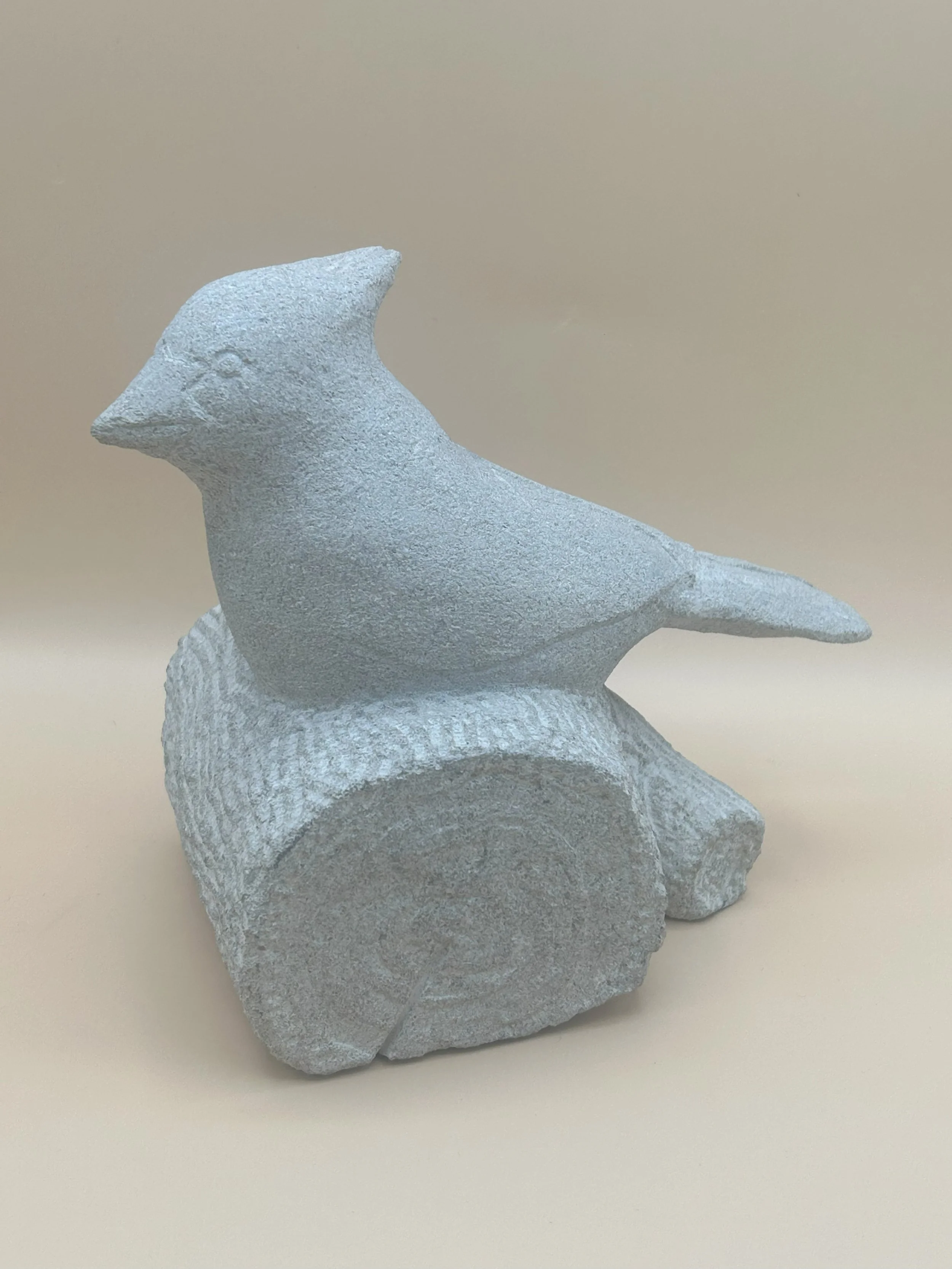 Here you go, a blue jay on a log. Simple huh? Well, it’s a heart breaker- or should I say a “tail breaker” because that’s what happened. When I put the stone into my vice I didn’t realize that the tail was in the vice and not the log and… well. But thanks to Gorilla Glue the tail is back. But because this results in a noticeable line where the crack was, I left the surface rough and unfinished- and it gives it an interesting look especially since the log was to be rough as well. But when it gets wet and the stone darkens, it’s pretty obvious, so I don’t know that this one will be making it to the streets. And here I thought it was the beak that was going to snap off.